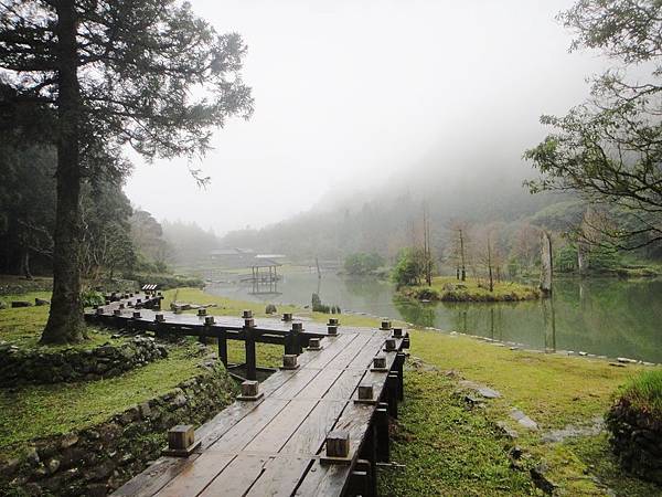 從我們居住的明池小木屋走到森林遊樂區入口約15分鐘,途中其實就可以看到明池了